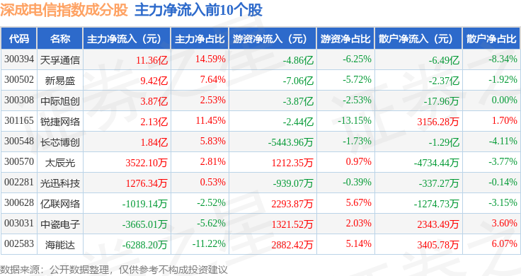 资金流向方面,深成电信(399688)指数成份股当日主力资金净流出合计17.02亿元,游资资金净流出合计4.29亿元,散户资金净流入合计21.31亿元。成份股资金流向详情见下表: