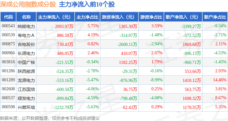 资金流向方面,深成公用(399689)指数成份股当日主力资金净流出合计6.71亿元,游资资金净流入合计2.63亿元,散户资金净流入合计4.08亿元。成份股资金流向详情见下表: