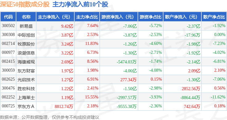 资金流向方面,深证50(399850)指数成份股当日主力资金净流出合计31.5亿元,游资资金净流出合计24.91亿元,散户资金净流入合计56.41亿元。成份股资金流向详情见下表:
