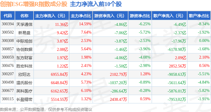 资金流向方面,创指ESG增强R(470034)指数成份股当日主力资金净流出合计44.38亿元,游资资金净流入合计5.16亿元,散户资金净流入合计39.23亿元。成份股资金流向详情见下表: