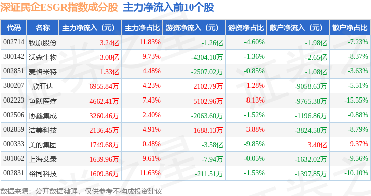 资金流向方面,深证民企ESGR(470056)指数成份股当日主力资金净流出合计94.96亿元,游资资金净流入合计18.8亿元,散户资金净流入合计76.17亿元。成份股资金流向详情见下表: