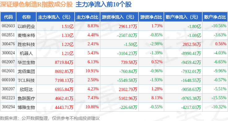 资金流向方面,深证绿色制造R(470069)指数成份股当日主力资金净流出合计142.68亿元,游资资金净流入合计37.12亿元,散户资金净流入合计105.56亿元。成份股资金流向详情见下表: