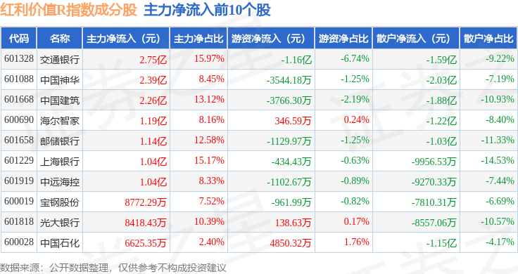 资金流向方面,红利价值R(489016)指数成份股当日主力资金净流入合计2.2亿元,游资资金净流出合计2.39亿元,散户资金净流入合计1942.99万元。成份股资金流向详情见下表: