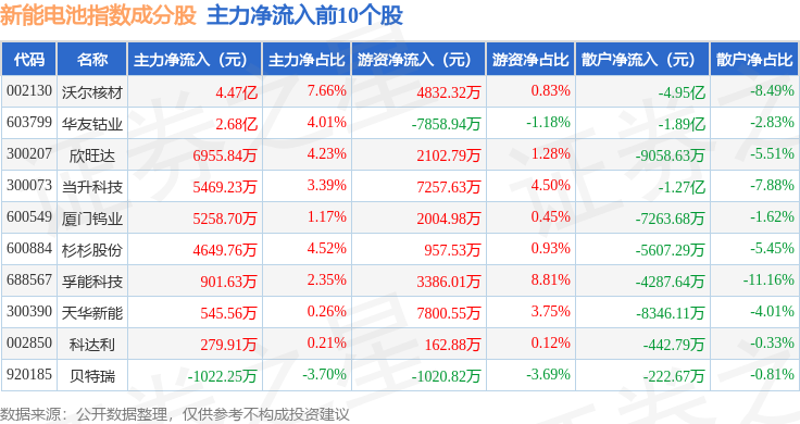 资金流向方面,新能电池(980032)指数成份股当日主力资金净流出合计44.34亿元,游资资金净流入合计12.17亿元,散户资金净流入合计31.94亿元。成份股资金流向详情见下表: