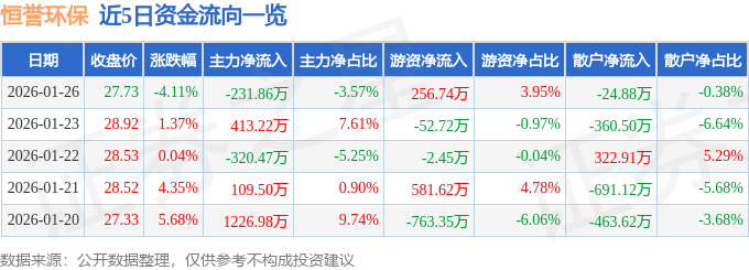 证券之星消息,截至2026年1月26日收盘,恒誉环保(688309)报收于27.73元,下跌4.11%,换手率2.94%,成交量2.33万手,成交额6502.89万元。