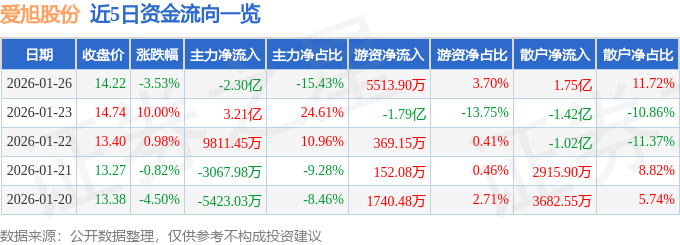 1月26日的资金流向数据方面,主力资金净流出2.3亿元,占总成交额15.43%,游资资金净流入5513.9万元,占总成交额3.7%,散户资金净流入1.75亿元,占总成交额11.72%。