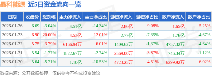 证券之星消息,截至2026年1月26日收盘,晶科能源(688223)报收于6.69元,下跌3.04%,换手率4.64%,成交量464.02万手,成交额31.44亿元。