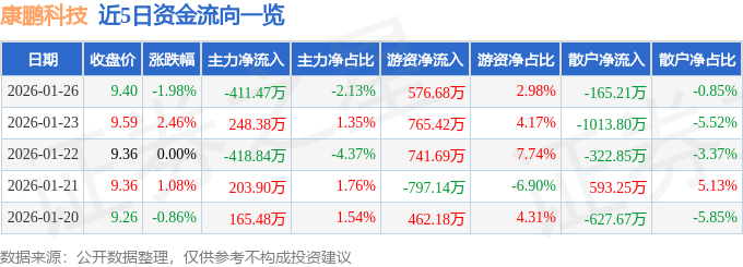 证券之星消息,截至2026年1月26日收盘,康鹏科技(688602)报收于9.4元,下跌1.98%,换手率7.85%,成交量20.38万手,成交额1.93亿元。