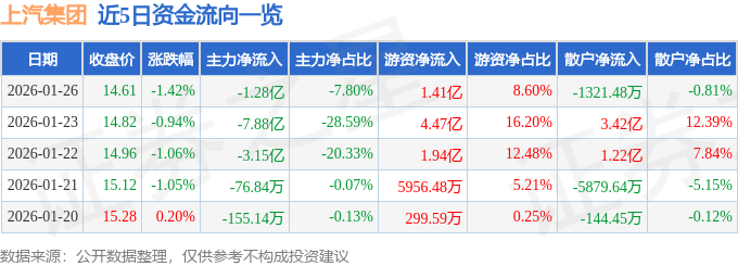 证券之星消息,截至2026年1月26日收盘,上汽集团(600104)报收于14.61元,下跌1.42%,换手率0.97%,成交量111.64万手,成交额16.35亿元。