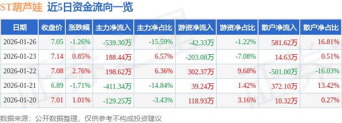 证券之星消息,截至2026年1月26日收盘,ST葫芦娃(605199)报收于7.05元,下跌1.26%,换手率1.23%,成交量4.94万手,成交额3459.86万元。