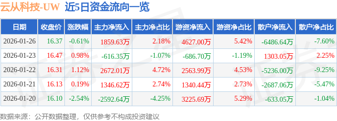 证券之星消息,截至2026年1月26日收盘,云从科技(688327)报收于16.37元,下跌0.61%,换手率6.25%,成交量52.08万手,成交额8.53亿元。