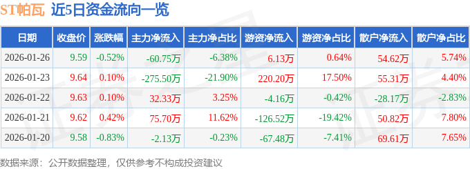 证券之星消息,截至2026年1月26日收盘,ST帕瓦(688184)报收于9.59元,下跌0.52%,换手率1.0%,成交量1.0万手,成交额951.73万元。