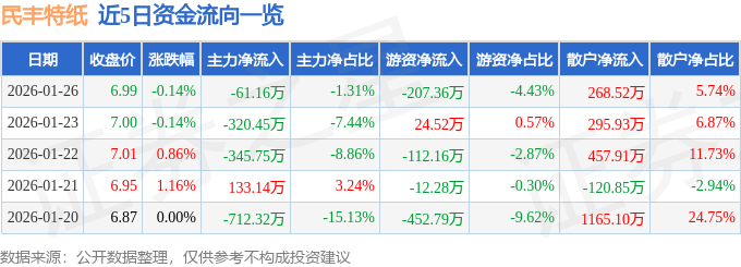 证券之星消息,截至2026年1月26日收盘,民丰特纸(600235)报收于6.99元,下跌0.14%,换手率1.91%,成交量6.7万手,成交额4682.07万元。