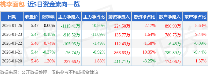 证券之星消息,截至2026年1月26日收盘,桃李面包(603866)报收于5.47元,上涨0.0%,换手率1.19%,成交量18.96万手,成交额1.03亿元。