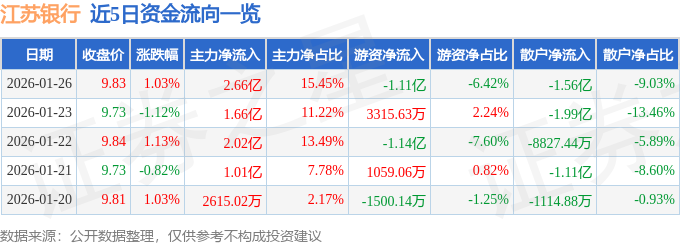 证券之星消息,截至2026年1月26日收盘,江苏银行(600919)报收于9.83元,上涨1.03%,换手率0.96%,成交量175.92万手,成交额17.25亿元。