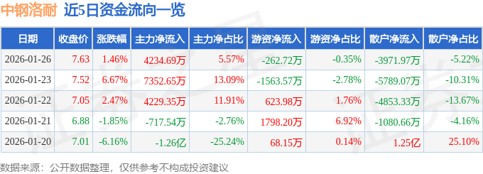 证券之星消息,截至2026年1月26日收盘,中钢洛耐(688119)报收于7.63元,上涨1.46%,换手率8.59%,成交量96.64万手,成交额7.61亿元。