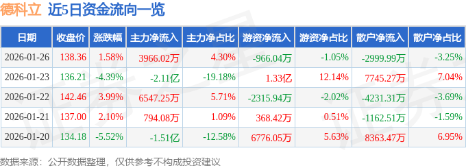 证券之星消息,截至2026年1月26日收盘,德科立(688205)报收于138.36元,上涨1.58%,换手率4.25%,成交量6.73万手,成交额9.23亿元。