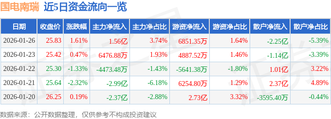 证券之星消息,截至2026年1月26日收盘,国电南瑞(600406)报收于25.83元,上涨1.61%,换手率2.0%,成交量160.32万手,成交额41.67亿元。