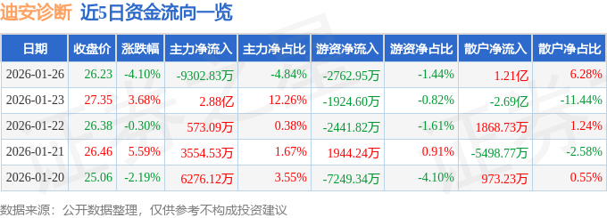证券之星消息,截至2026年1月26日收盘,迪安诊断(300244)报收于26.23元,下跌4.1%,换手率14.5%,成交量72.73万手,成交额19.22亿元。