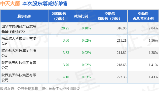 证券之星消息,1月26日中天火箭发布公告《中天火箭:陕西中天火箭技术股份有限公司关于持股5%以上股东及其一致行动人减持时间区间届满暨实施结果的公告》,其股东陕西航天科技集团有限公司、国华军民融合产业发展基金(有限合伙)于2025年11月27日至2025年12月31日间合计减持43.48万股,占公司目前总股本的0.2798%,变动期间该股股价上涨46.86%,截止12月31日收盘报78.54元。