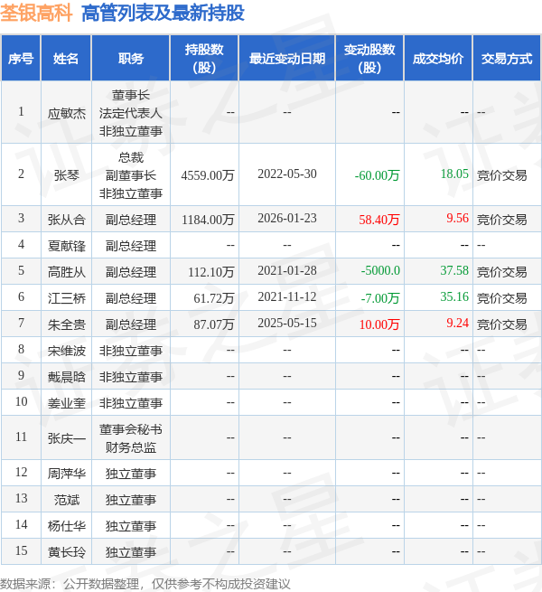 荃银高科近半年内的董监高及核心技术人员增减持详情如下: