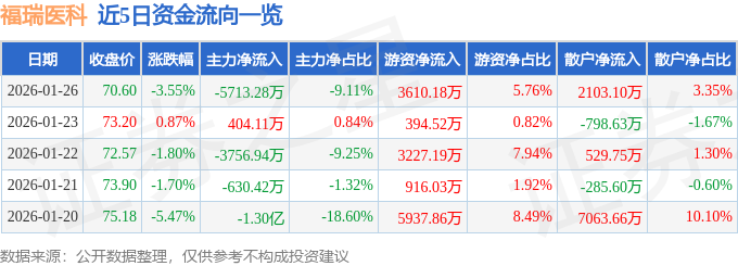 证券之星消息,截至2026年1月26日收盘,福瑞医科(300049)报收于70.6元,下跌3.55%,换手率3.76%,成交量8.77万手,成交额6.27亿元。