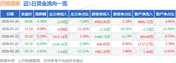 1月26日的资金流向数据方面,主力资金净流出1.59亿元,占总成交额7.24%,游资资金净流入6966.96万元,占总成交额3.18%,散户资金净流入8886.72万元,占总成交额4.06%。