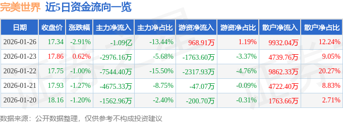 证券之星消息,截至2026年1月26日收盘,完美世界(002624)报收于17.34元,下跌2.91%,换手率2.55%,成交量46.55万手,成交额8.11亿元。