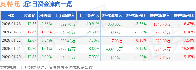 证券之星消息,截至2026年1月26日收盘,奥 特 迅(002227)报收于12.57元,下跌2.33%,换手率2.04%,成交量5.02万手,成交额6349.79万元。