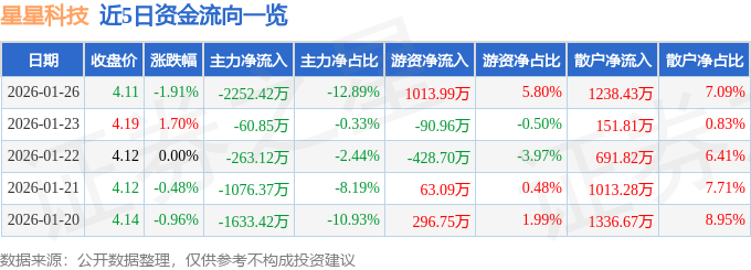 证券之星消息,截至2026年1月26日收盘,星星科技(300256)报收于4.11元,下跌1.91%,换手率1.89%,成交量42.3万手,成交额1.75亿元。