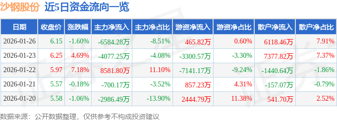 证券之星消息,截至2026年1月26日收盘,沙钢股份(002075)报收于6.15元,下跌1.6%,换手率5.64%,成交量123.67万手,成交额7.74亿元。