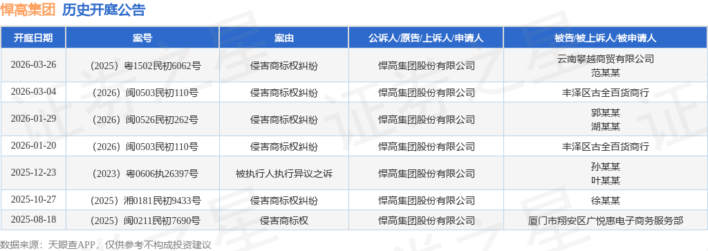 根据统计,近一年内以悍高集团股份有限公司为当事人的历史开庭公告有7则,其中案由为“侵害商标权纠纷”的公告以5则居首,其次为“侵害商标权”有1则,“被执行人执行异议之诉”有1则。历史开庭公告如下: