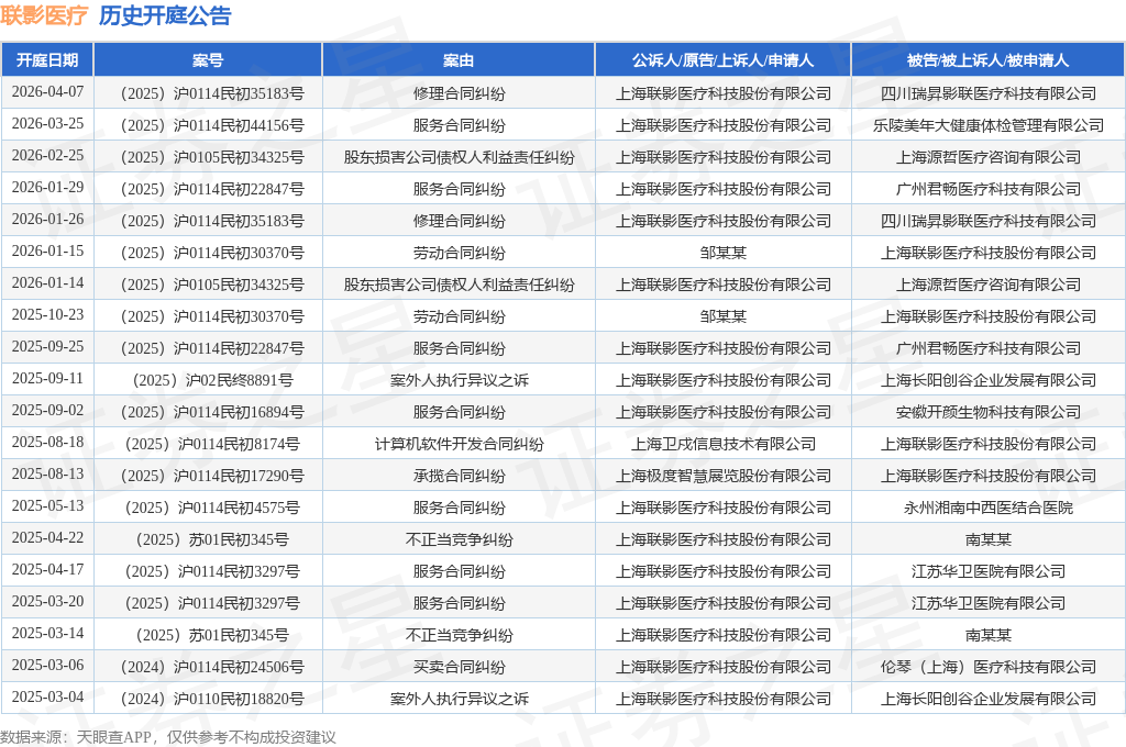 案号:(2025)沪0114民初22847号根据统计,近一年内以上海联影医疗科技股份有限公司为当事人的历史开庭公告有21则,其中案由为“服务合同纠纷”的公告以7则居首,其次为“不正当竞争纠纷”有2则,“买卖合同纠纷”有2则。历史开庭公告(前20条)如下: