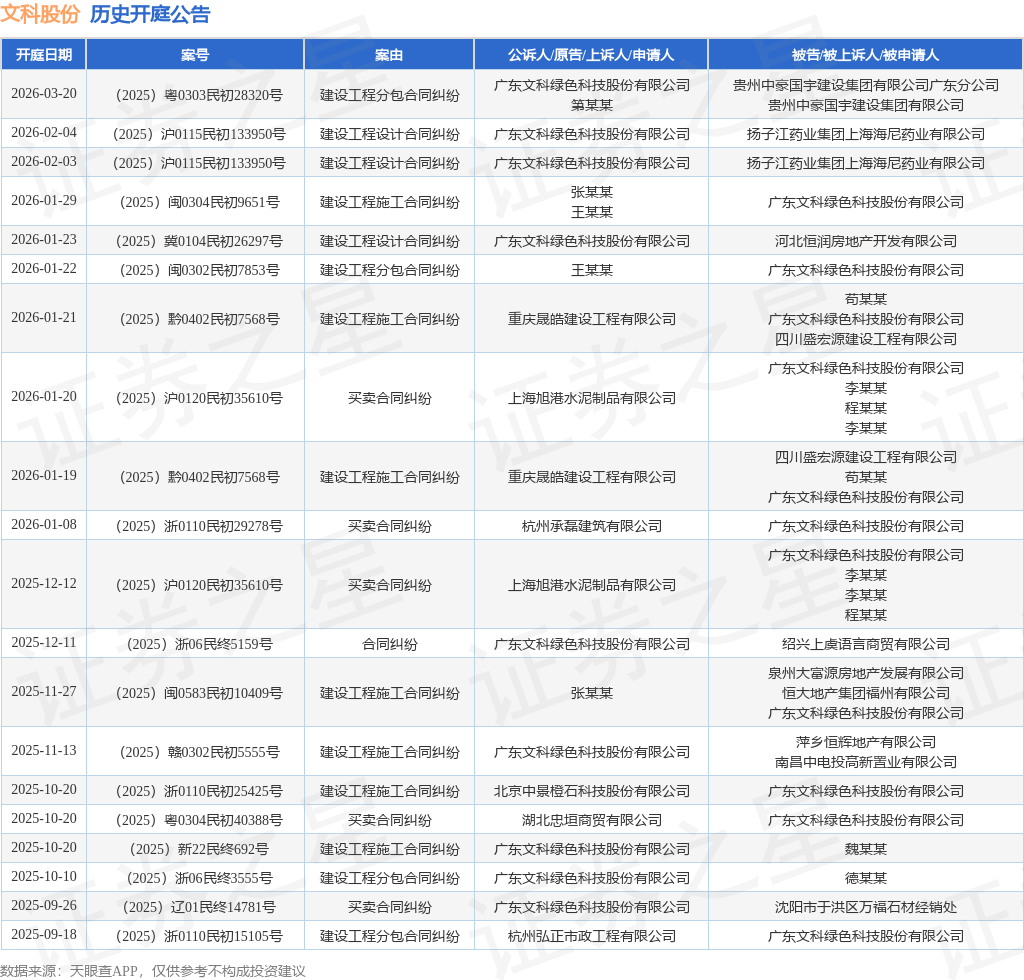 案号:(2025)闽0304民初9651号根据统计,近一年内以广东文科绿色科技股份有限公司为当事人的历史开庭公告有79则,其中案由为“建设工程施工合同纠纷”的公告以23则居首,其次为“买卖合同纠纷”有16则,“劳务合同纠纷”有13则。历史开庭公告(前20条)如下: