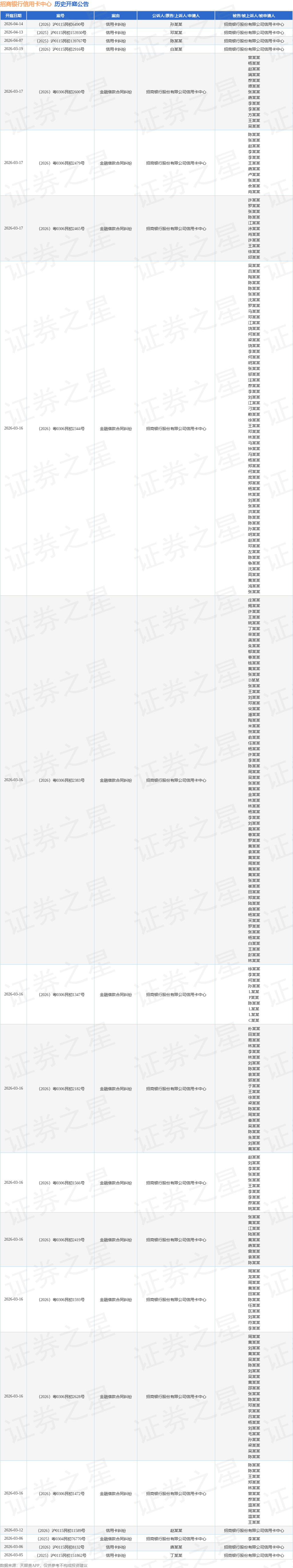 案号:(2025)沪0115民初79857号根据统计,近一年内以招商银行股份有限公司信用卡中心为当事人的历史开庭公告有11284则,其中案由为“信用卡纠纷”的公告以9246则居首,其次为“金融借款合同纠纷”有1918则,“小额借款合同纠纷”有30则。历史开庭公告(前20条)如下: