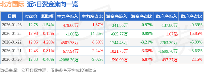 证券之星消息,截至2026年1月26日收盘,北方国际(000065)报收于12.78元,下跌1.54%,换手率2.81%,成交量27.36万手,成交额3.51亿元。