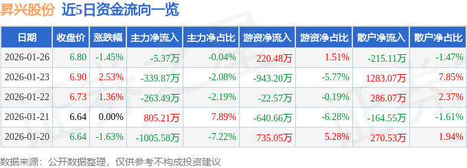 证券之星消息,截至2026年1月26日收盘,昇兴股份(002752)报收于6.8元,下跌1.45%,换手率2.2%,成交量21.49万手,成交额1.46亿元。