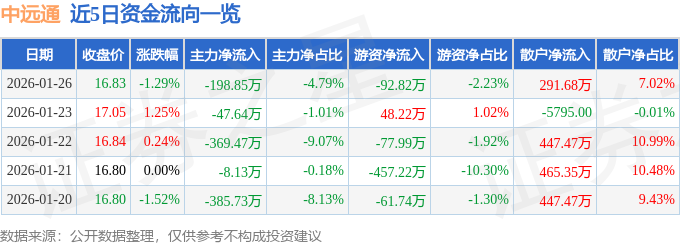 1月26日的资金流向数据方面,主力资金净流出198.85万元,占总成交额4.79%,游资资金净流出92.82万元,占总成交额2.23%,散户资金净流入291.68万元,占总成交额7.02%。