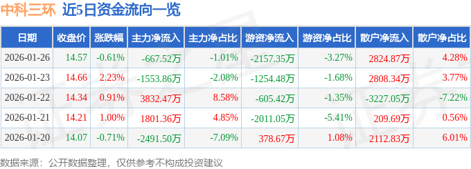 证券之星消息,截至2026年1月26日收盘,中科三环(000970)报收于14.57元,下跌0.61%,换手率3.71%,成交量45.12万手,成交额6.61亿元。