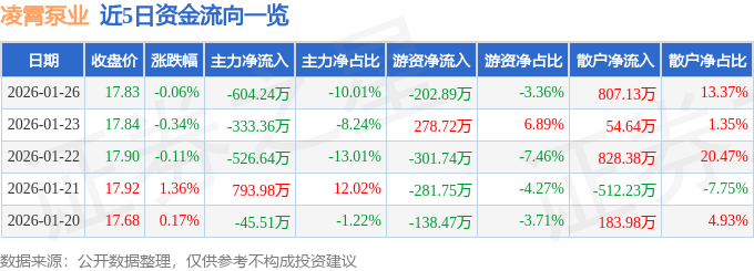 证券之星消息,截至2026年1月26日收盘,凌霄泵业(002884)报收于17.83元,下跌0.06%,换手率1.24%,成交量3.38万手,成交额6034.79万元。