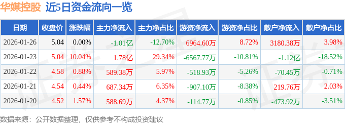 证券之星消息,截至2026年1月26日收盘,华媒控股(000607)报收于5.04元,上涨0.0%,换手率17.73%,成交量156.95万手,成交额7.99亿元。