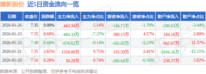 证券之星消息,截至2026年1月26日收盘,建新股份(300107)报收于7.35元,上涨0.0%,换手率3.38%,成交量11.75万手,成交额8623.03万元。