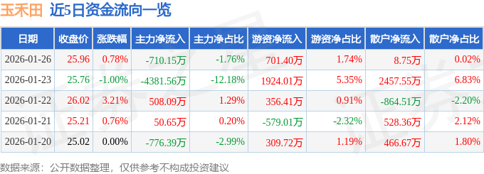 证券之星消息,截至2026年1月26日收盘,玉禾田(300815)报收于25.96元,上涨0.78%,换手率3.98%,成交量15.53万手,成交额4.04亿元。