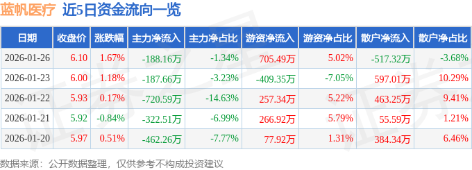 证券之星消息,截至2026年1月26日收盘,蓝帆医疗(002382)报收于6.1元,上涨1.67%,换手率2.32%,成交量23.18万手,成交额1.41亿元。