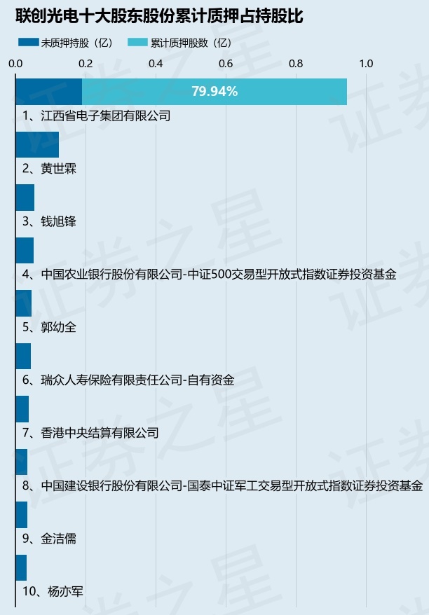 截止本公告日,股东江西省电子集团有限公司已累计质押股份7573.03万股,占其持股总数的79.94%。本次质押后联创光电十大股东的累计质押股份占持股比例(占持股比例的计算以公司最新一期财务报表公布的十大股东的持股总数为基准)见下图: