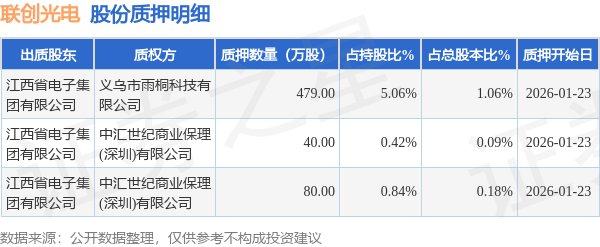 证券之星消息,联创光电(600363)1月27日公开信息显示,股东江西省电子集团有限公司向义乌市雨桐科技有限公司、中汇世纪商业保理(深圳)有限公司合计质押599.0万股,占总股本1.33%。质押详情见下表: