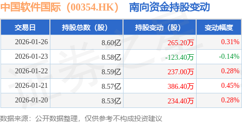 证券之星消息,1月26日南向资金增持265.2万股中国软件国际(00354.HK)。近5个交易日中,获南向资金增持的有4天,累计净增持999.6万股。近20个交易日中,获南向资金增持的有12天,累计净增持2567.4万股。截至目前,南向资金持有中国软件国际(00354.HK)8.6亿股,占公司已发行普通股的31.48%。