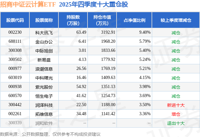 招商中证云计算ETF基金成立于2021年3月25日,基金经理为房俊一,基金跟踪标的为中证云计算与大数据主题指数,成立以来超额回报为5.88%,近一个月超额回报为-0.11%。最新披露的基金持仓数据显示,截止2025年12月31日,该基金第一大重仓股为科大讯飞(002230),持股占比为9.4%。