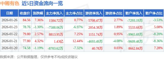证券之星消息,截至2026年1月26日收盘,中稀有色(600259)报收于84.56元,上涨7.36%,换手率7.31%,成交量24.58万手,成交额20.64亿元。