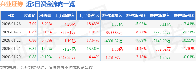 证券之星消息,截至2026年1月26日收盘,兴业证券(601377)报收于7.09元,上涨3.2%,换手率3.78%,成交量326.01万手,成交额23.2亿元。